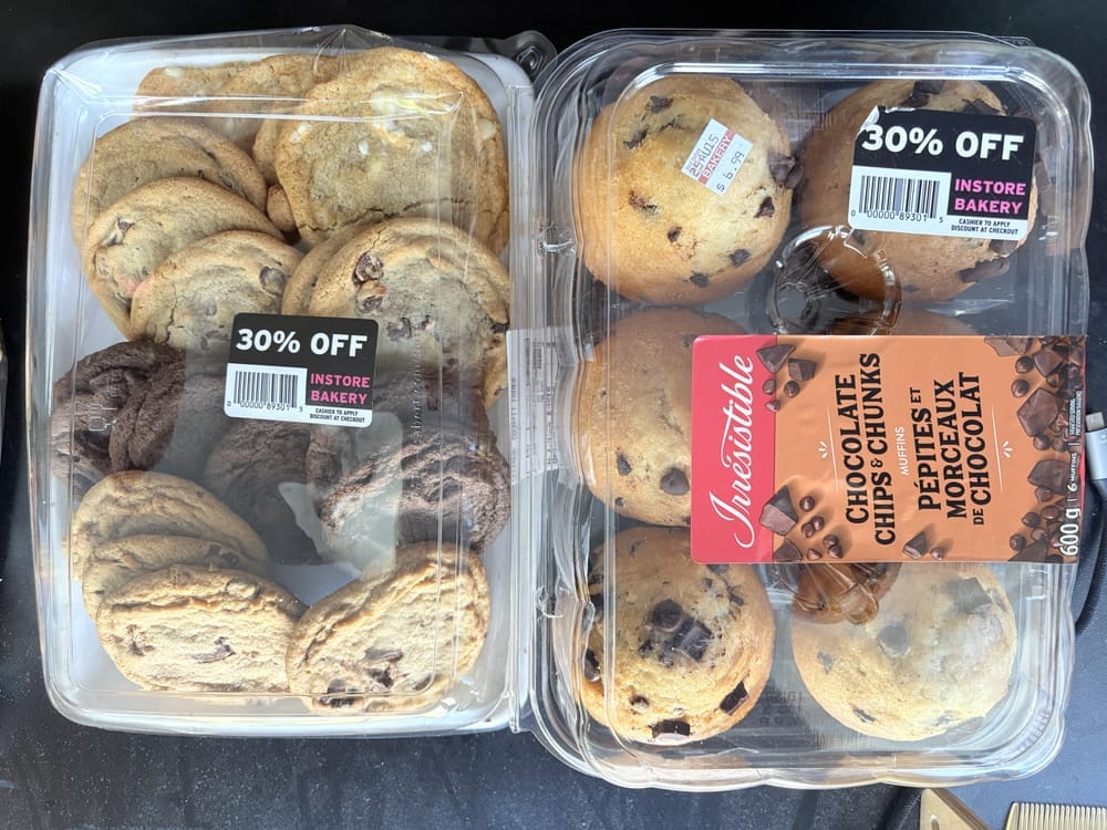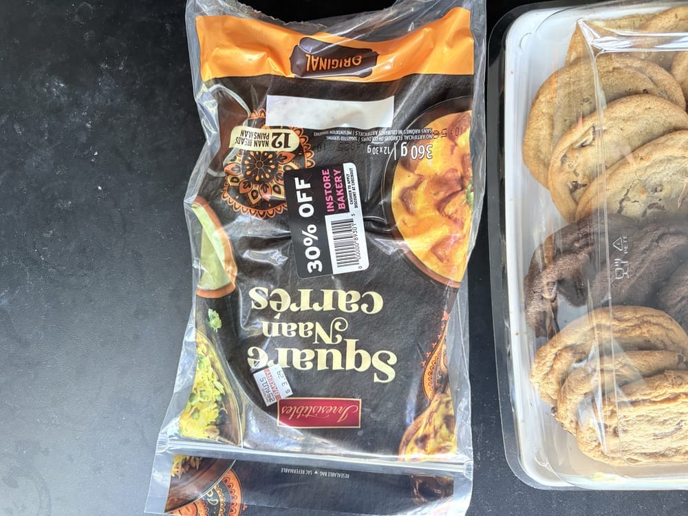 What I got was muffins, cookies, and a pack of naan. Not what I was hoping for, but I baked the naan in the oven and had it as toast. Given my love affair with sugar, I had zero complaints about the muffins and cookies. They all had the same-day expiry, so I froze everything right away.