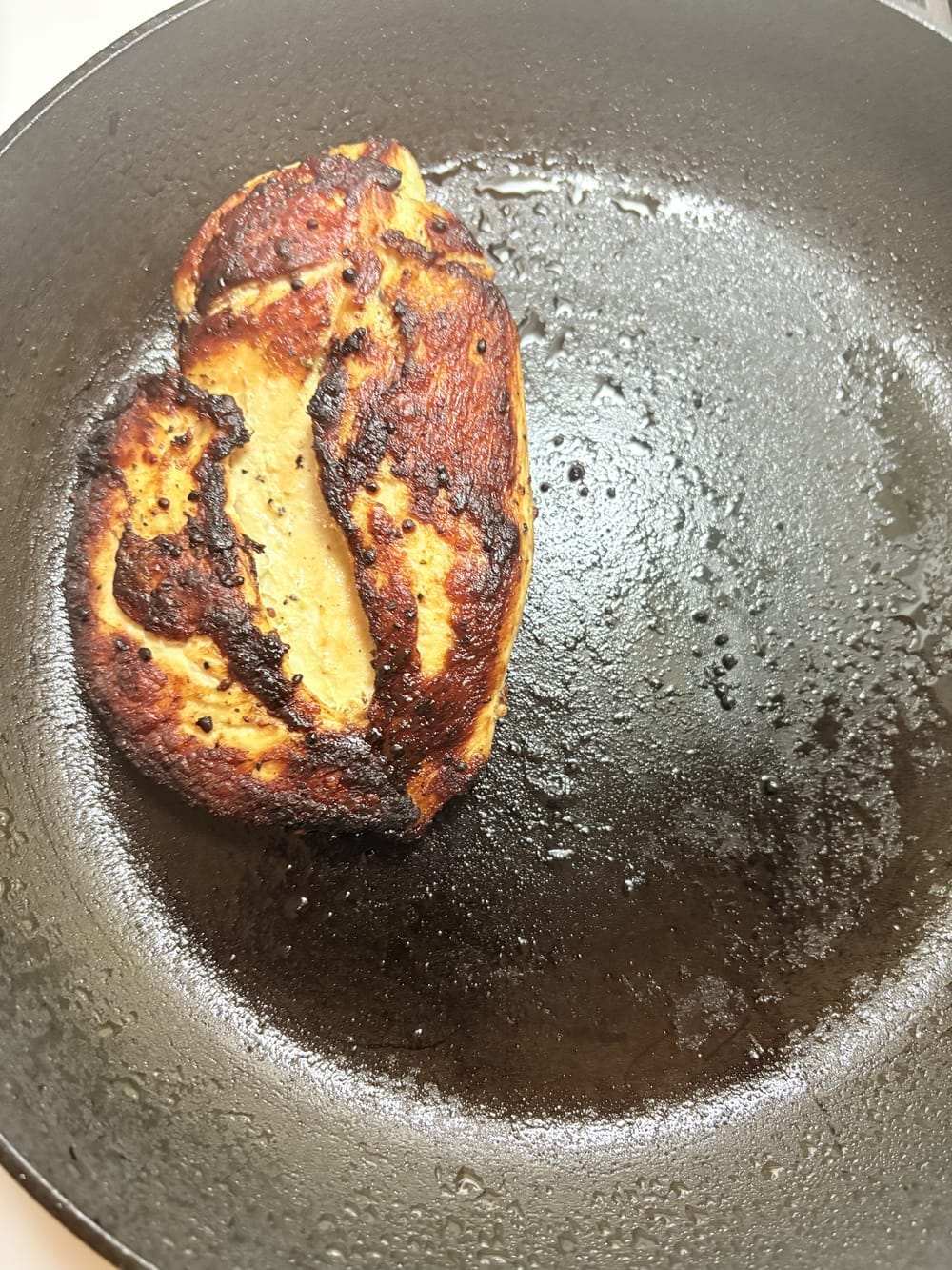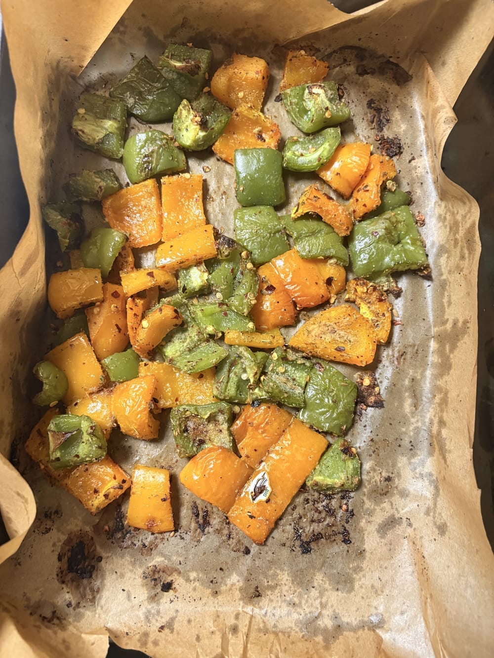The chicken was pre-seasoned, so all I had to do was toss it in a pan with oil. To turn it into a full meal, I roasted three potatoes and a bell pepper from my Flashfood haul. One of the potatoes had gone bad (again), which didn’t even surprise me anymore.