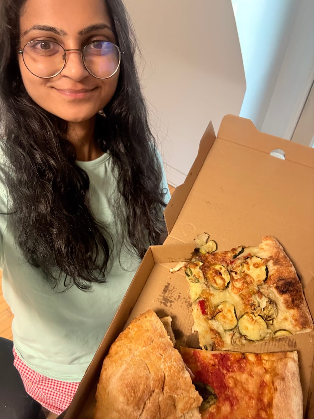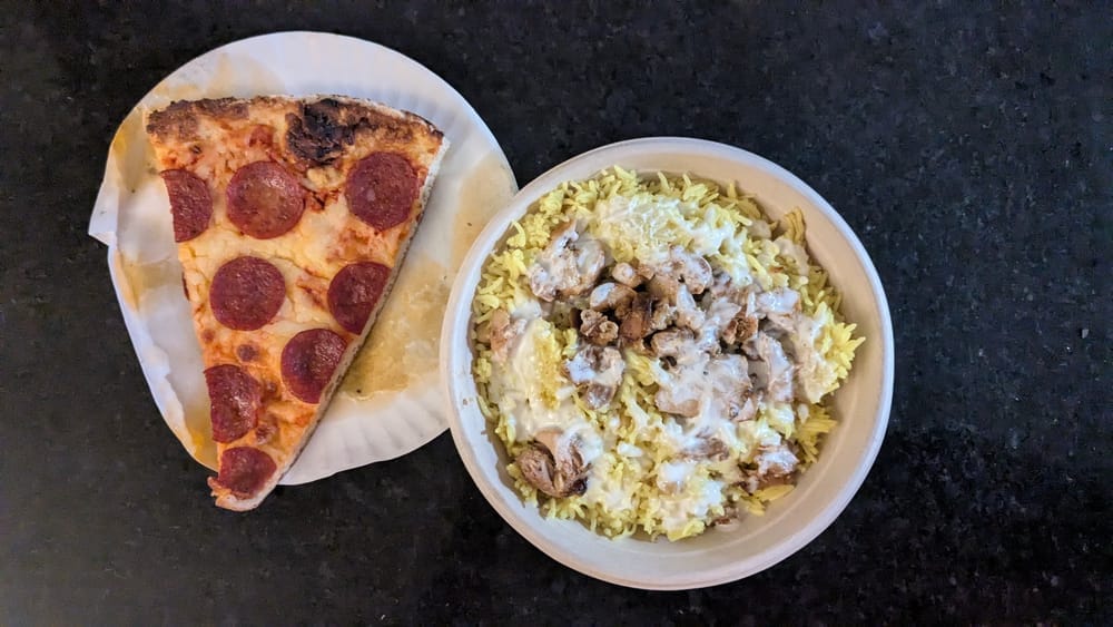 I got a chicken and rice bowl and a slice of pizza. The only downside was that the pickup window started at 11 p.m. Not ideal, but I was too tired to care.