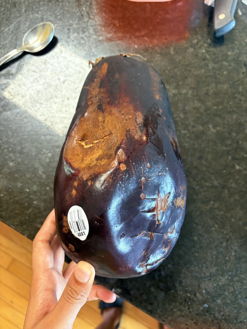 For dinner, I planned to grill the two eggplants with some seasoning and call it a night. But by the time I started cooking, one of them had already gone bad. I roasted the one that was still hanging on, added half an onion, and blended it into a dip to eat with rice. Surprisingly and luckily, it turned out good! A silver lining in a week of wrinkly tomatoes and expired chicken.