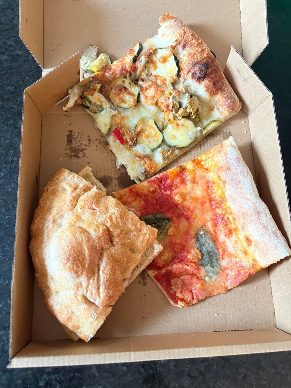 My first meal was a mystery bag from Carolina Pizzeria. Inside were two cold pizza slices and a sandwich of sorts. It looked like someone placed plain chicken (or maybe turkey?) deli slices between bread and called it a day. No sauces or veggies. Just vibes. I had the Margherita slice and half the sandwich for dinner. Heated up, the pizza was actually solid with a chewy crust, real basil and decent cheese. The sandwich would’ve worked better with my beloved sriracha mayo, but it still got the job done.