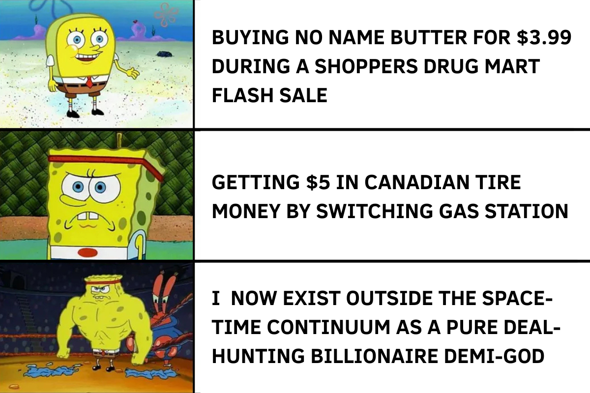 Another example of low-hanging fruit is the flash sales Shoppers Drug Mart frequently hosts. A few weeks ago, they offered No Name butter for $3.99 and a dozen eggs for $2.99. This deal lasted only two days, but it was likely 25% to 40% off.