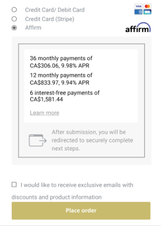 I found one Canadian hot tub company (there may be others) that offers Buy Now Pay Later (BNPL) financing through Affirm.