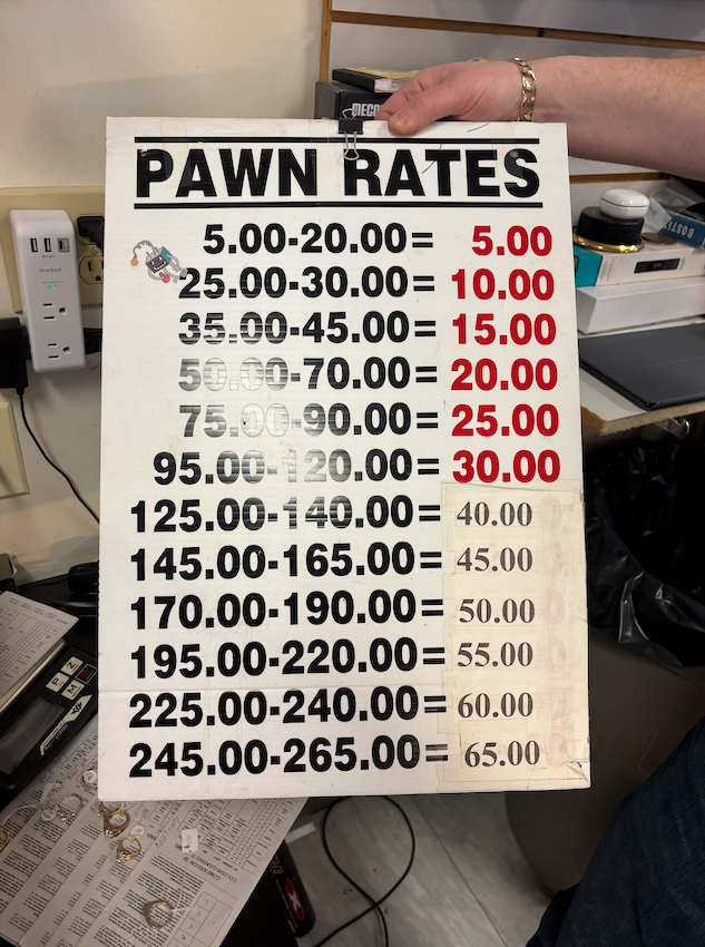 I then asked about the $30 fee. He showed me the following pawn rate table: