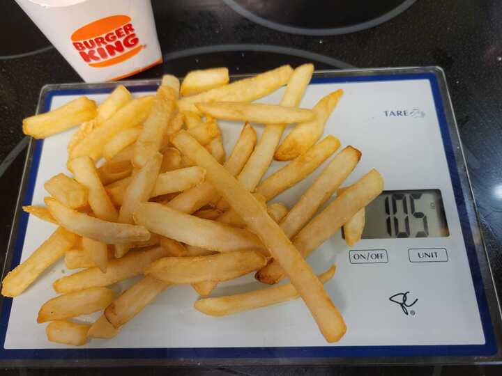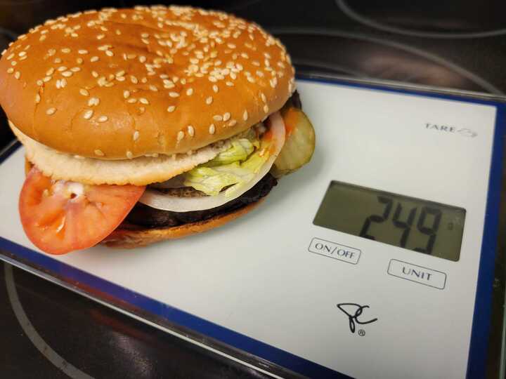 The single beef patty weighed 78 grams, which is more meat than the Big Mac’s two patties combined! The total Whopper burger weighed 249 grams with all the toppings. And the medium fries weighed 106 grams.