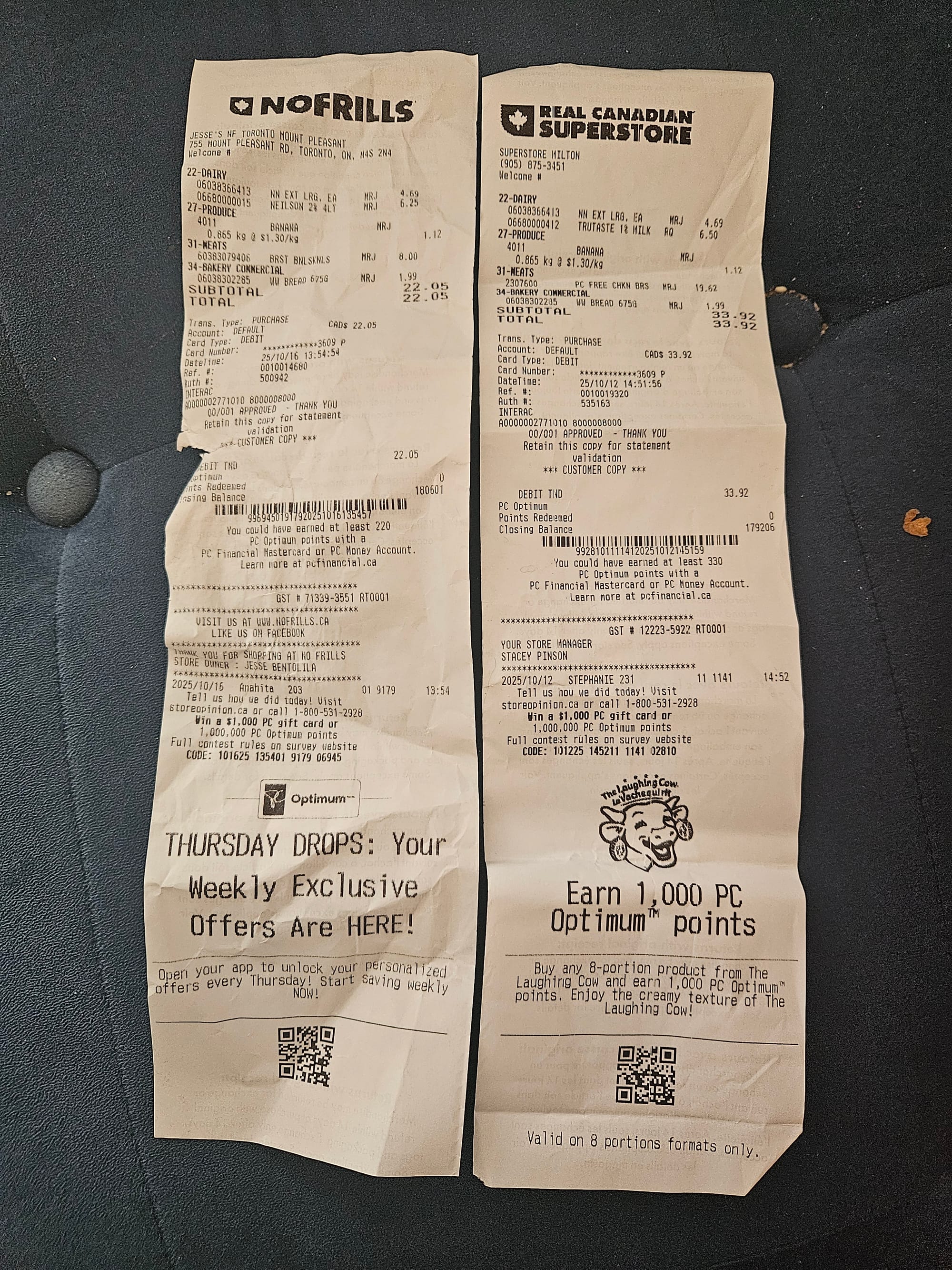 Both stores were relatively easy to get to, I walked about 15 minutes to the No Frills and the bus took about 25-28 minutes to get to the Superstore. Both were clean, easy to navigate and pretty busy. The Supercentre is significantly much bigger, but had more parking as it’s located in a more industrial area with more space.