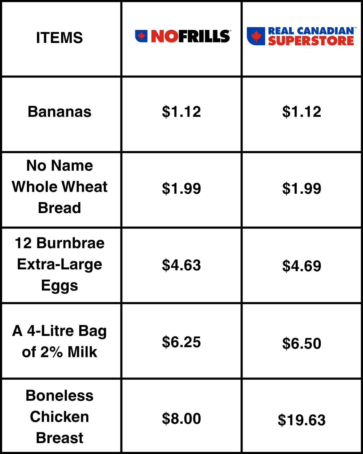 I created the list by focusing on basics that most of us would buy: bread, milk, especially the 4L bag, a dozen eggs, bananas and a pack of 2-3 boneless, skinless chicken breasts. I looked at the cheapest options and the house brands for both stores. No Frills has the famous yellow No Name brand while Supercentre, which does carry the No Name brand, also has the PC brand.