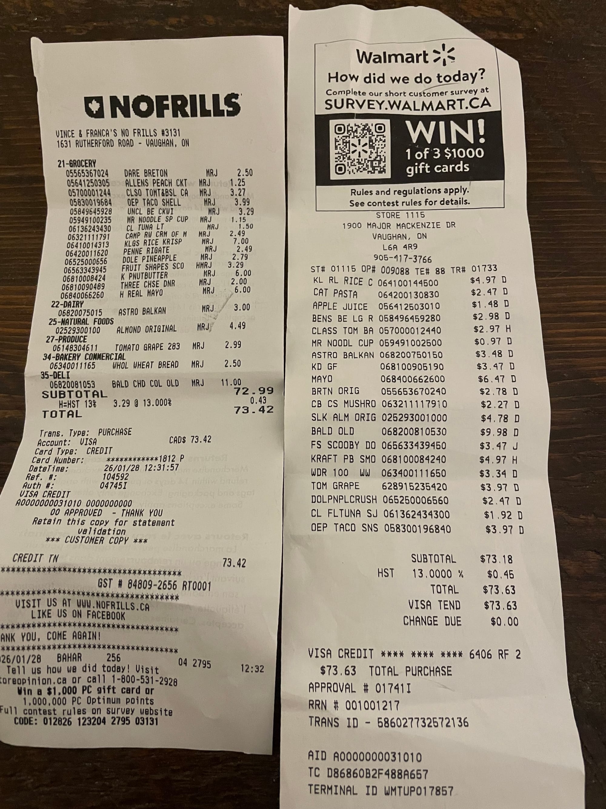 To determine the cheapest retailer, I purchased the exact same 20 grocery items at Walmart, then and at a nearby No Frills. The grocery list represents a typical shop for a 30-something single mom (a friend of mine, who I brought along).