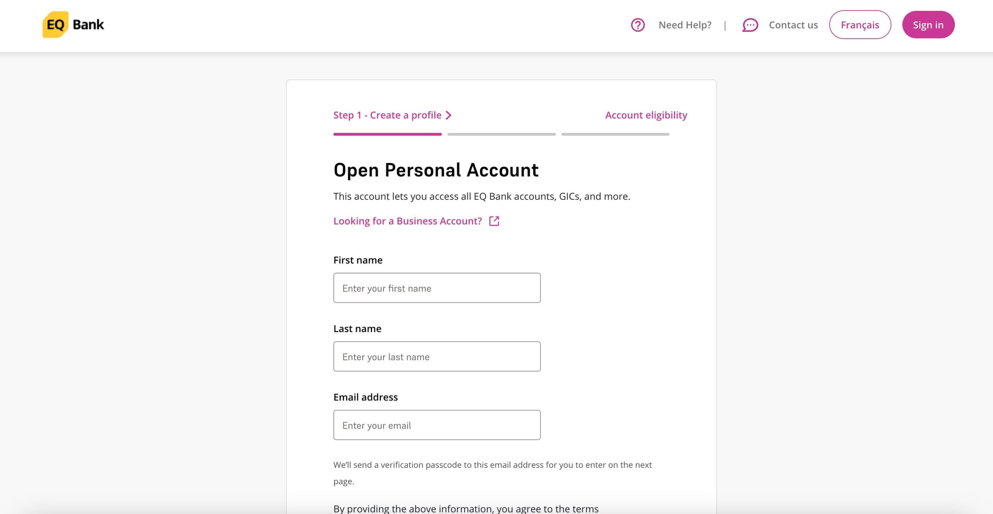 To get started with EQ, I had to provide my email address and phone number and receive a verification code. From there, they asked me to choose an account type, which was a personal savings account.
