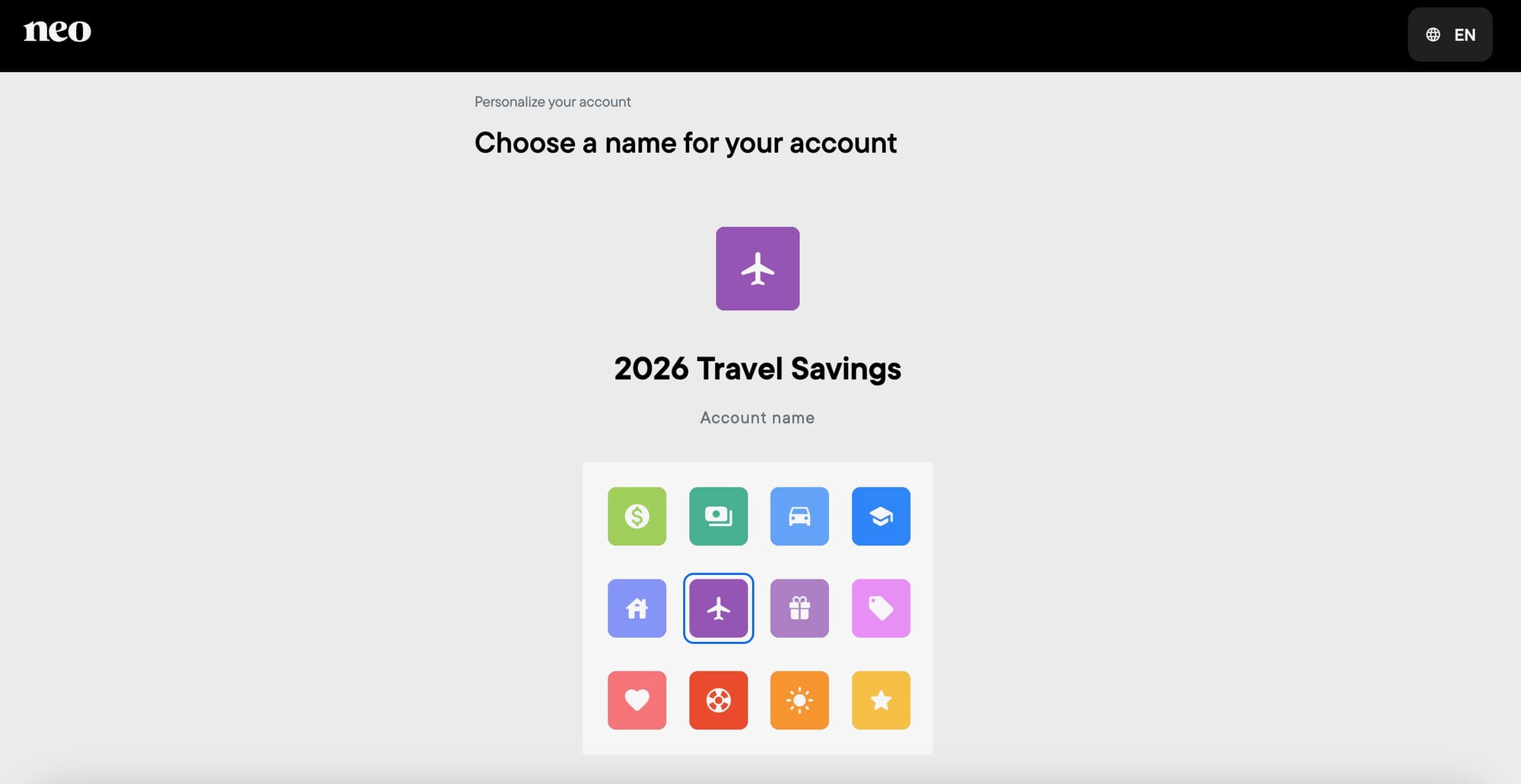 The process of opening my Neo Savings account was almost identical to opening an EQ Bank account, with one twist. After providing Neo with my email and phone number and receiving my verification code, I was given the option to personalize my account by assigning it a name and an icon. Very cool! I decided to name it Travel Savings 2026. (Here’s hoping!)