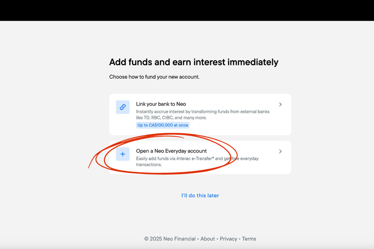 I should point out that I had the option to send the $10 to Neo via Interac e-Transfer; however, Neo states that to do so, you must also open a New Everyday account. I wasn’t prepared to do that. You can see that in the screenshot below: