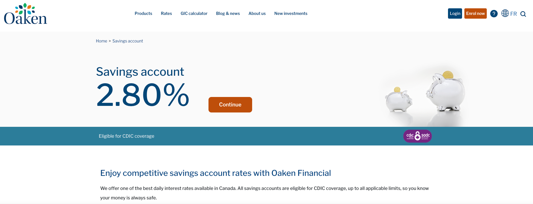 Oaken Financial is a digital banking platform and subsidiary of Home Trust. It offers a range of deposit products, including a no-fee high-interest savings account.