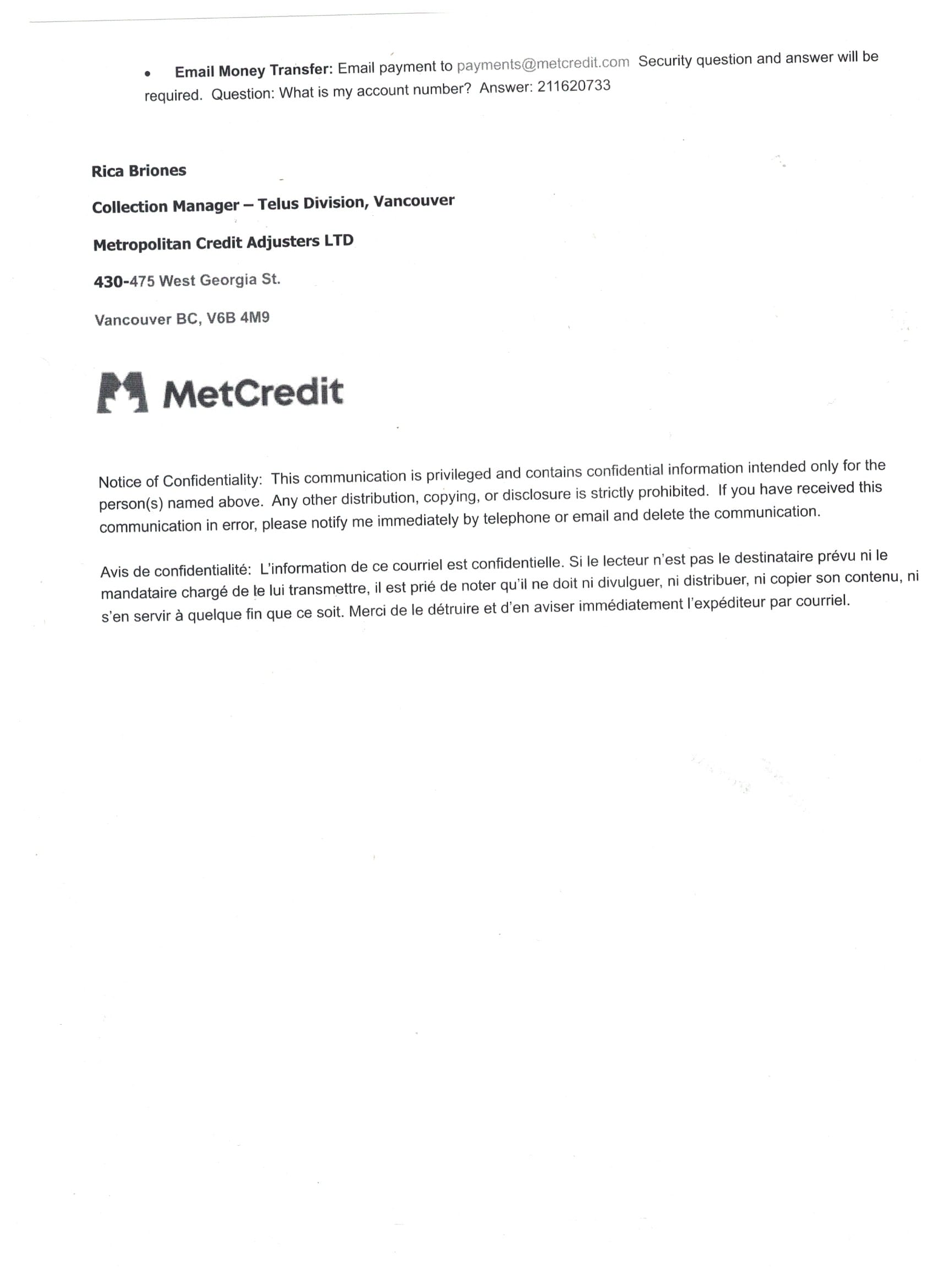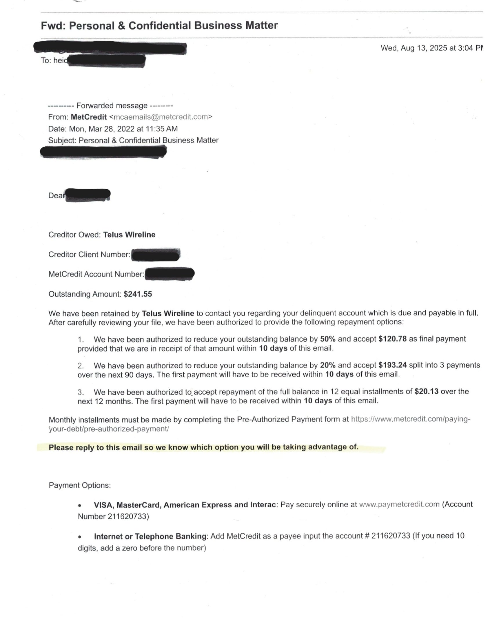 Take this MetCredit letter sent to Jules M. On the surface, it looks professional and non-threatening. The outstanding balance is neatly itemized, and multiple payment options are offered. There’s even a polite request to “reply to this email so we know which option you will be taking advantage of.”